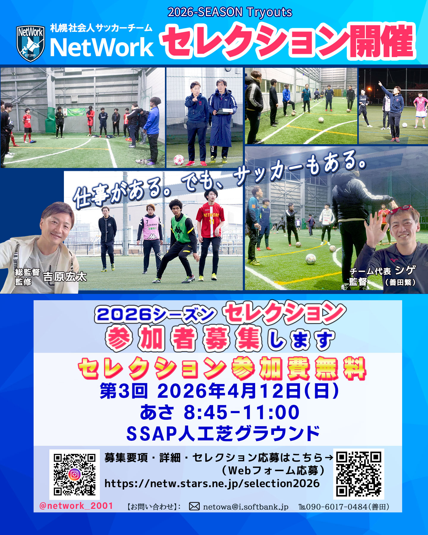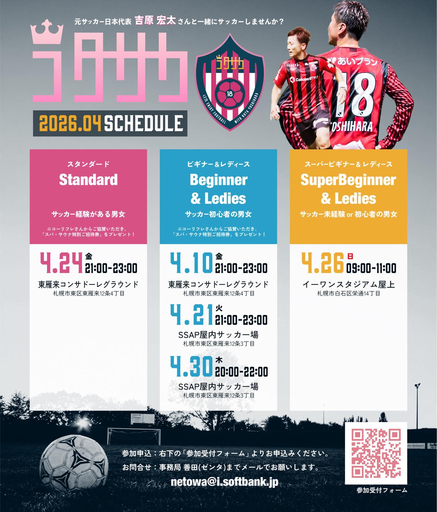札幌社会人サッカーチーム『NetWork』、それと並行に活動をしている、2018年4月〜総監督の吉原宏太さんと代表のシゲで取り組んでる【コタサカ】⚽️のご案内です。